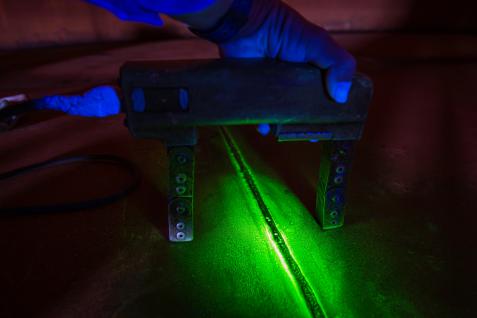 白色反差增强剂(如 PFINDER 280 )用于提升对比度。需将其均匀喷涂于检测表面,涂层应尽可能薄 (最大干膜厚度 50µm)。涂层过厚可能影响检测结果。喷涂后需等待涂层完全干燥。